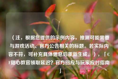 ** ,《穿越火线》(CF)部分玩家反映“甜心教官”活动奖励领取出现延迟问题,引发社区讨论,官方迅速回应称,因参与人数激增导致系统短暂拥堵,技术团队正在紧急优化,预计24小时内恢复,建议玩家错峰领取,并检查游戏内邮箱或活动页面补发通知,若超时未到账,可通过 渠道提交角色信息核实,官方承诺将补偿受影响玩家限时道具作为致歉,玩家可关注官网公告获取最新进展,避免因 波动重复操作,此次事件凸显了热门活动的高并发压力,但官方快速响应态度获得多数玩家认可。
