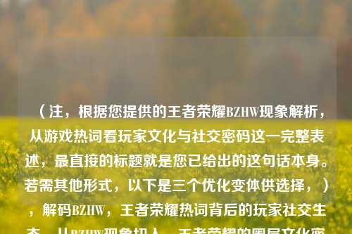 “BZHW”不仅是《王者荣耀》的缩影,更是数字时代青年文化的体现,它展现了玩家如何通过语言重构游戏意义,将虚拟竞技场转化为情感联结的社交空间,随着游戏与生活的进一步融合,这类“热词”或许会成为更广泛的文化符号。