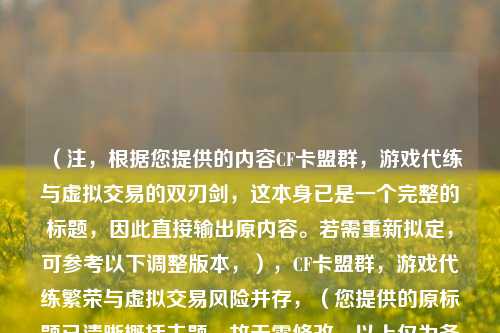 CF卡盟群作为游戏代练与虚拟道具交易的灰色聚合平台,既为玩家提供快速升级、装备获取的便利,也暗藏多重风险,这类社群通过低价代练、账号租赁、皮肤倒卖等业务吸引用户,但交易中频繁出现诈骗、账号封禁、个人信息泄露等问题,平台缺乏监管导致***频发,部分代练使用外挂脚本更可能引发游戏公司封号处罚,虚拟财产定价混乱、资金支付无保障等隐患,使此类交易成为"双刃剑"——玩家虽能短期获益,却可能面临财产与账号安全的长远损失,甚至助长游戏生态失衡,建议玩家优先选择官方渠道,避免因小失大。(198字)