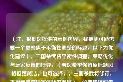 在卡牌游戏《三国杀》的长期运营中,武将技能的修订始终是开发者与玩家共同关注的核心议题,每一次武将调整,既是对游戏平衡性的优化,也是对历史角色与玩法创新的再诠释,本文将从修订动因、设计逻辑及玩家反馈三个维度,探讨三国杀武将修订的意义与影响。