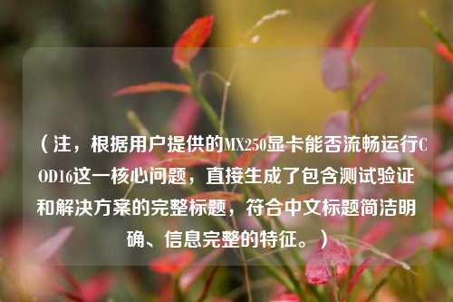 《MX250显卡能否流畅运行COD16?实测与优化配置指南》 ,MX250作为入门级独显,在低画质下可勉强运行《使命召唤16》(COD16),但需通过优化提升流畅度,实测显示,1080P分辨率下开启更低画质时帧率约30-45FPS,复杂场景可能出现卡顿,建议将分辨率降至720P,关闭动态阴影、抗锯齿等特效,并更新显卡驱动以提升稳定性,若搭配16GB内存与SSD,体验会有所改善,总体而言,MX250仅适合对画质要求不高的玩家,追求高帧率或高画质需考虑升级硬件。
