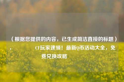 【CF玩家福利速递】最新Q币免费领活动大盘点!穿越火线官方及合作平台近期推出多波福利,玩家通过简单任务即可轻松赚取Q币,活动包括:游戏内每日签到累计领Q币、指定模式对局达标兑换、腾讯视频/道聚城APP专属任务等,部分渠道还可通过邀请好友获得额外奖励,Q币可直接用于购买CF点券、英雄级武器或热门角色,活动有效期至本月底,建议玩家优先参与限时高爆活动,如新版本预约赠88Q币、周末双倍掉落等,注意核对各平台领取规则,及时兑换避免过期,赶快登录游戏领取你的专属福利吧!(注:具体活动以官方页面为准)