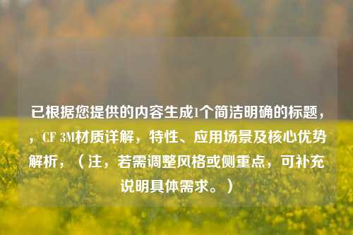 CF 3M是一种高性能复合材料,通常由碳纤维(Carbon Fiber, CF)与3M公司开发的特殊树脂或粘合剂复合而成,其名称中的“3M”可能指代美国3M公司的专利技术,也可能是某种特定型号的标识,这种材质结合了碳纤维的轻量化、高强度和3M材料的耐化学性、粘合性能,广泛应用于航空航天、汽车制造、体育器材等领域。