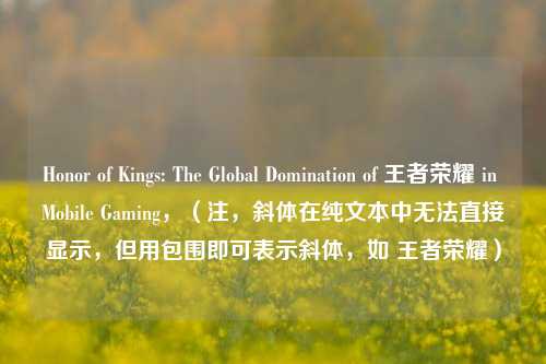 ** ,*Honor of Kings* (《王者荣耀》) has emerged as a global phenomenon in the mobile gaming industry, captivating millions of players worldwide. Developed by Tencent, this multiplayer online battle arena (MOBA) game combines strategic gameplay, cultural elements, and social interaction, making it a standout success. Its dominance stems from localized adaptations, such as *Arena of Valor* for international markets, and a robust esports ecosystem. With over 100 million daily active users and massive revenue, *Honor of Kings* exemplifies China's influence in gaming. The title's斜体英文写法为 *Honor of Kings*,通过创新设计、跨平台兼容性和社区驱动内容,持续引领全球手游市场。