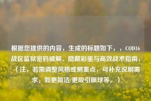 在《使命召唤:现代战争》(COD16)的“战区”模式中,监狱(Prison)作为地图上的关键区域之一,不仅因其丰富的资源和高风险战斗而闻名,还隐藏着许多玩家津津乐道的彩蛋和谜题。“监狱密码”一直是玩家社区热议的话题,本文将深入解析监狱密码的由来、破解 *** ,以及它在游戏中的实际用途。