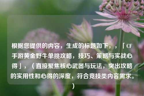 在《CF手游》中单挑黄金野牛需要结合枪械特性与战术策略,黄金野牛作为冲锋枪,射速快但后坐力较大,建议中近距离作战时优先瞄准头部,利用其高爆发快速击杀,走位方面,采用“S型移动”或“跳跃射击”干扰对手预瞄,同时利用掩体规避伤害,实战中注意控制弹药消耗,避免换弹时被反打,预判敌人走位并提前开火压制,配合闪光弹创造优势,心态上保持冷静,通过反复练习掌握弹道节奏,逐步提升对枪胜率,灵活运用上述技巧,可在1v1中有效压制对手,发挥黄金野牛的近战统治力。