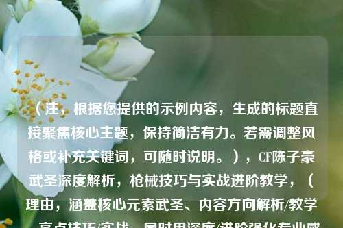 在《穿越火线》(CF)的竞技舞台上,职业选手陈子豪凭借精湛的技术和独特的战术风格吸引了大量粉丝,他使用“武圣”系列武器的实战视频更是被玩家奉为教科书级别的教学素材,本文将从枪械特性、操作技巧和实战应用三个角度,深度解析陈子豪的武圣视频,帮助玩家提升游戏水平。