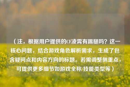 经实测,凌霄默认没有专属踢腿动作,CF中踢腿(即近战攻击)通常是通用动作,部分角色(如审判者、零)因技能设计会附带特殊踢腿,但凌霄的应急攻击更倾向于快速刀击或拳击,而非踢腿。